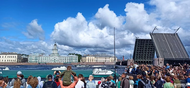 Тысячи людей с утра 19 июля собрались на набережных Невы в Петербурге, чтобы посмотреть развод мостов и репетицию военно-морского парада перед Днём ВМФ.