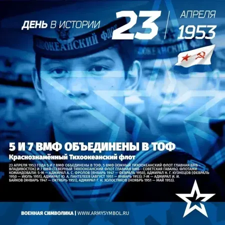 23 апреля 1953 г. Тихоокеанский флот был возрожден. В 1947 г. ТОФ упразднили, разделив на два объединения – 5-й ВМФ (Владивосток) и 7-й ВМФ (Советская Гавань). Но такое решение усложнило управление силами на Дальнем Востоке. В 1953 г. оба флота вновь объединились в Тихоокеанский. Уже в год воссоздания ТОФ, пополнившись новейшими кораблями, в том числе морской ракетоносной авиацией (а затем и тяжелыми авианесущими крейсерами), ТОФ мог тягаться с вероятным противником на равных.