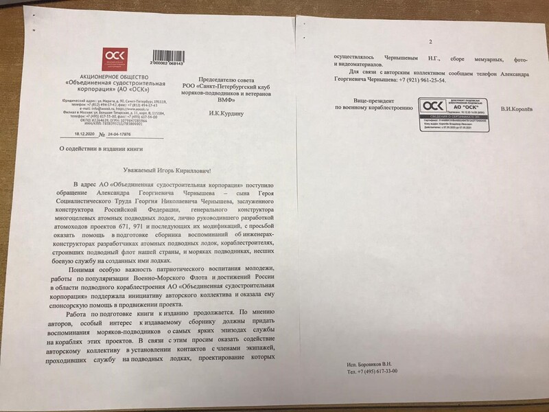 В адрес Клуба поступило письмо АО "Объединенная судостроительная компания" о содействии в издании книги.