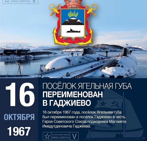 В этот день, 16 октября 1967 года, посёлок Ягельная губа был переименован в поселок Гаджиево в честь Героя Советского Союза подводника Магомета Имадутдиновича Гаджиева.
