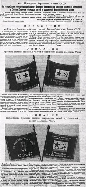 5 февраля 1944 г. Указом Президиума Верховного Совета СССР были утверждены Гвардейские и Красные Знамена частей и соединений Военно-Морского Флота. Согласно положению, Красное Знамя войсковых частей Военно-Морского Флота является символом объединения и внутренней спайки воинской части, символом воинской чести, доблести и славы; знамя является напоминанием каждому из военно-служащих части об их священном долге преданно служить Советской Родине. Красное Знамя вручается войсковой части по ее сформировании от имени Президиума Верховного-Совета СССР.